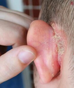 It’s not uncommon for childhood eczema to manifest in the ear area. This happens because the skin there is very thin and is exposed to various irritants on a daily basis: tight hats, headphones, shampoo that runs, or even synthetic fabrics in constant contact.
