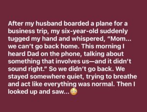 After my husband boarded a plane for a business trip, my six-year-old suddenly tugged my hand and whispered, “Mom… we can’t go back home. This morning I heard Dad on the phone, talking about something that involves us—and it didn’t sound right.” So we didn’t go back. We stayed somewhere quiet, trying to breathe and act like everything was normal. Then I looked up and saw…